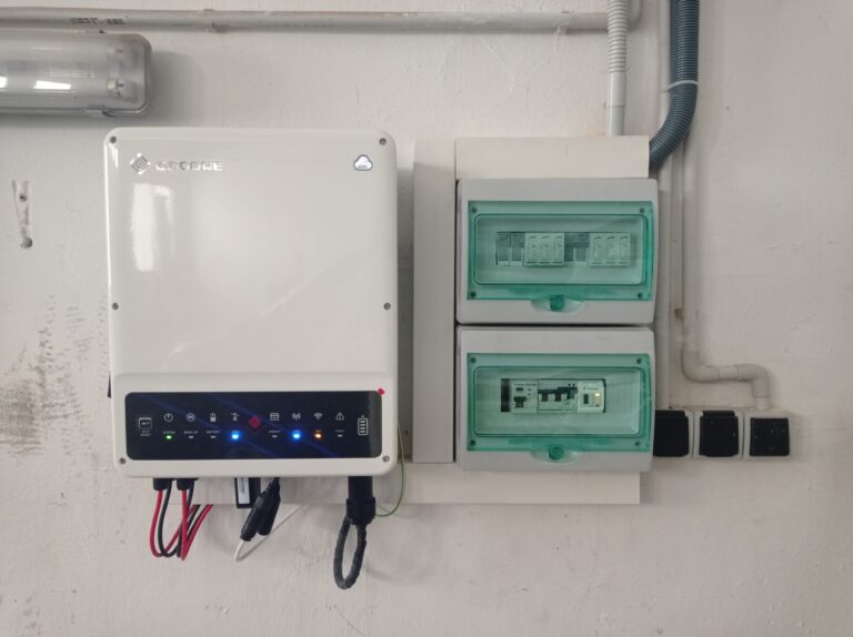 Instalación fotovoltaica conectada en red interior. Compuesta por 18 paneles de 410 w y con una estructura hecha a medida. Inversor Goodwe monofásico de 6 kW de potencia.