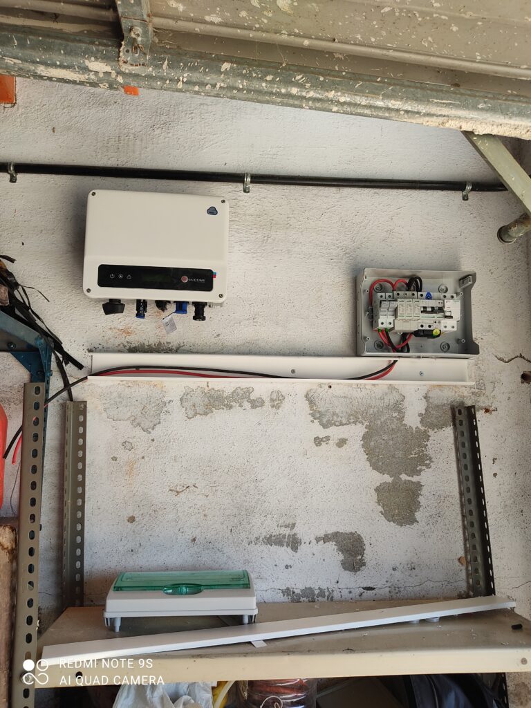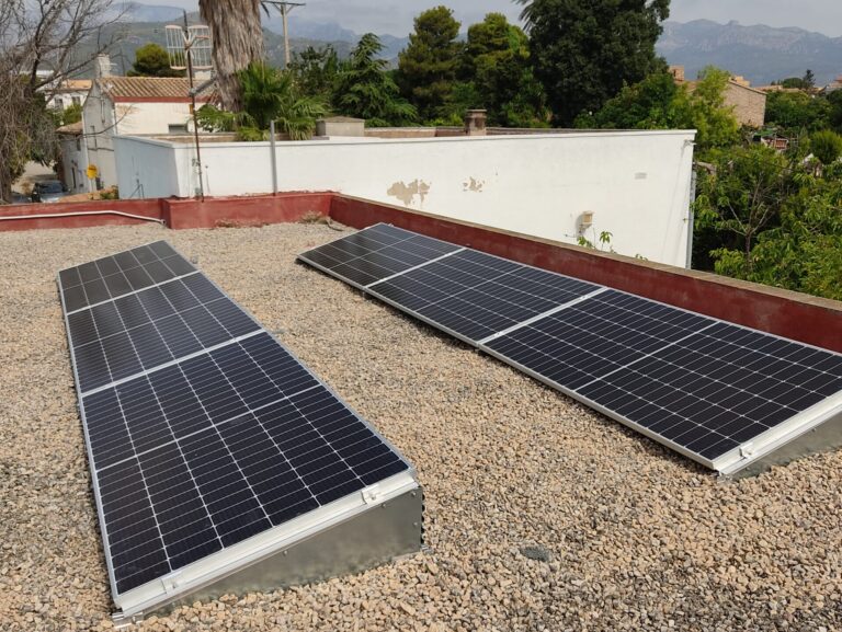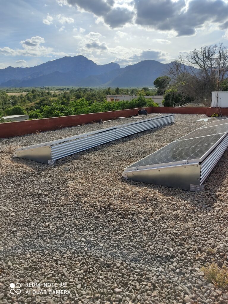 Instalación fotovoltaica de autoconsumo conectada en red interior. Compuesta por 6 paneles de 455 w y con una estructura inclinada para cubierta plana lastrada sunfer.