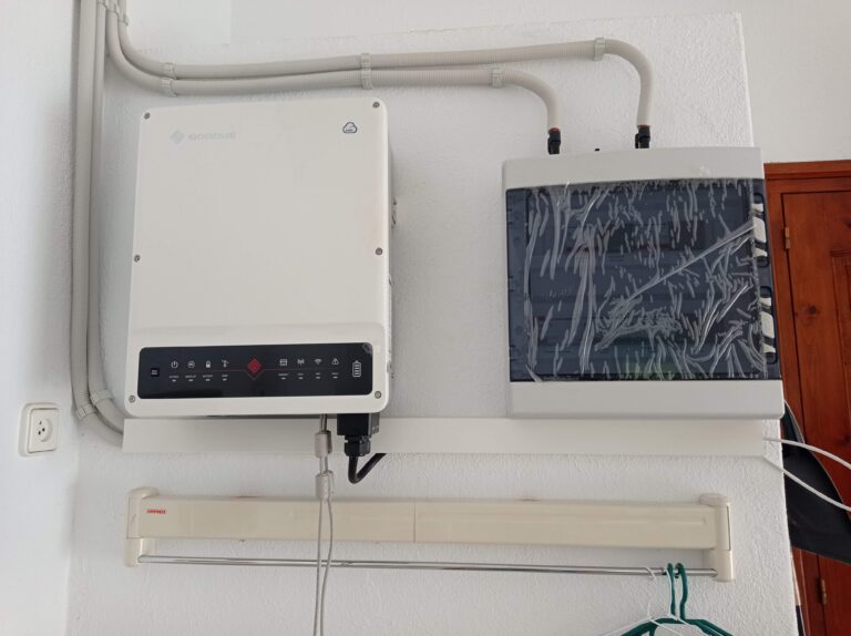 Instalación fotovoltaica de autoconsumo. Compuesta por 24 paneles de 455w encima de una estructura coplanar para cubierta de teja. Inversor trifásico Goodwe de 10 kW.