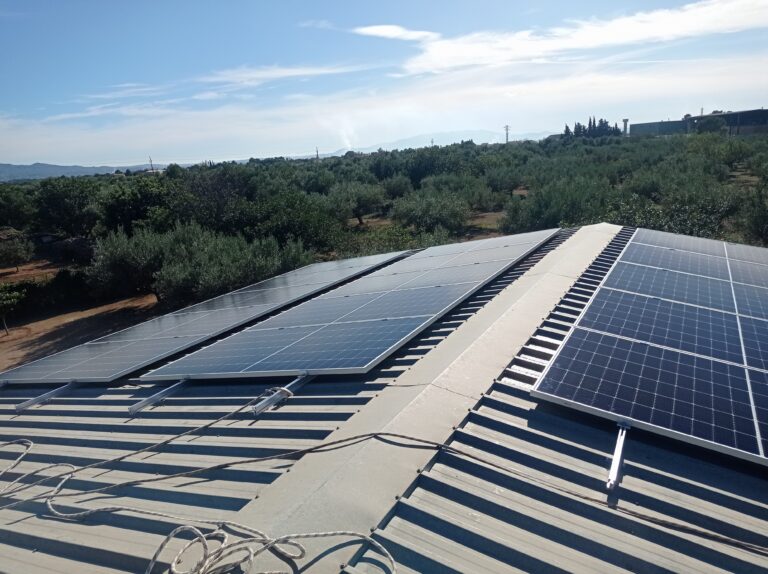 Instalación fotovoltaica de autoconsumo, conectada en la red interior del propietario. Está compuesta por 20 módulos fotovoltaicos de 510 w, con una estructura coplanar para cubierta de chapa metálica.